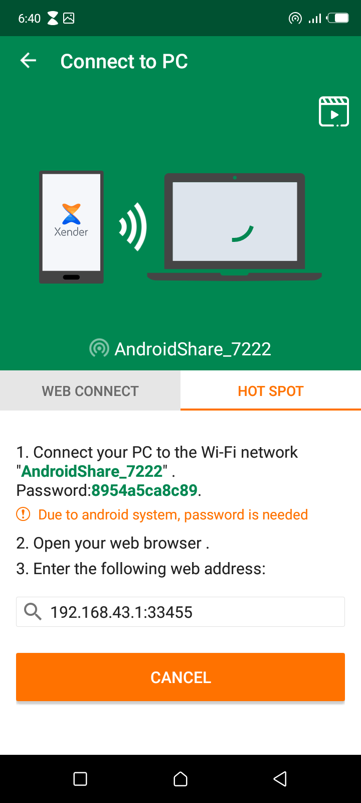 Your Android device will instruct you to turn on your Hotspot and location. When they are successfully turned on, then go to your personal computer or laptop and turn on its WiFi. Then search for the Android device WiFi or Hotspot name (it is provided on the screen of your Android device e.g Androidshare_7222 in the picture below) and connect it, type in the password shown on the screen of your Android device if required, as not all Xender versions use the password to connect. When it is done, go to any browser on the personal computer or laptop, and on the search space, type in the IP address provided on the last line of the write-up on your Android device e.g 192.168.43.1:33455 in the picture below.