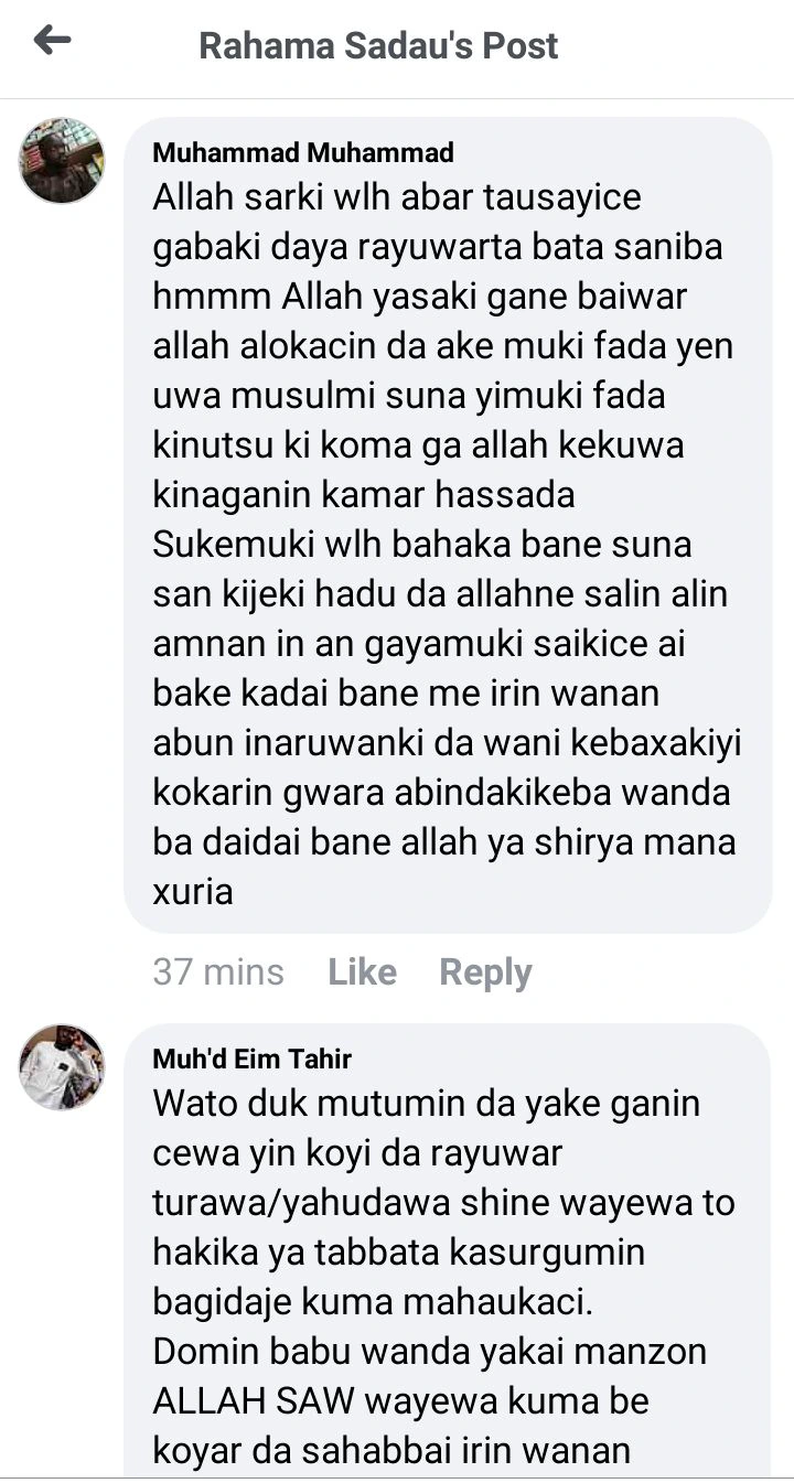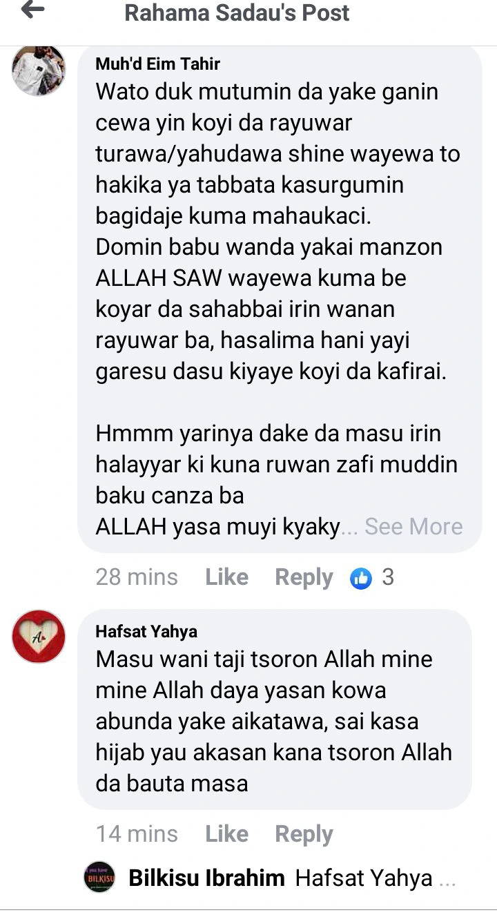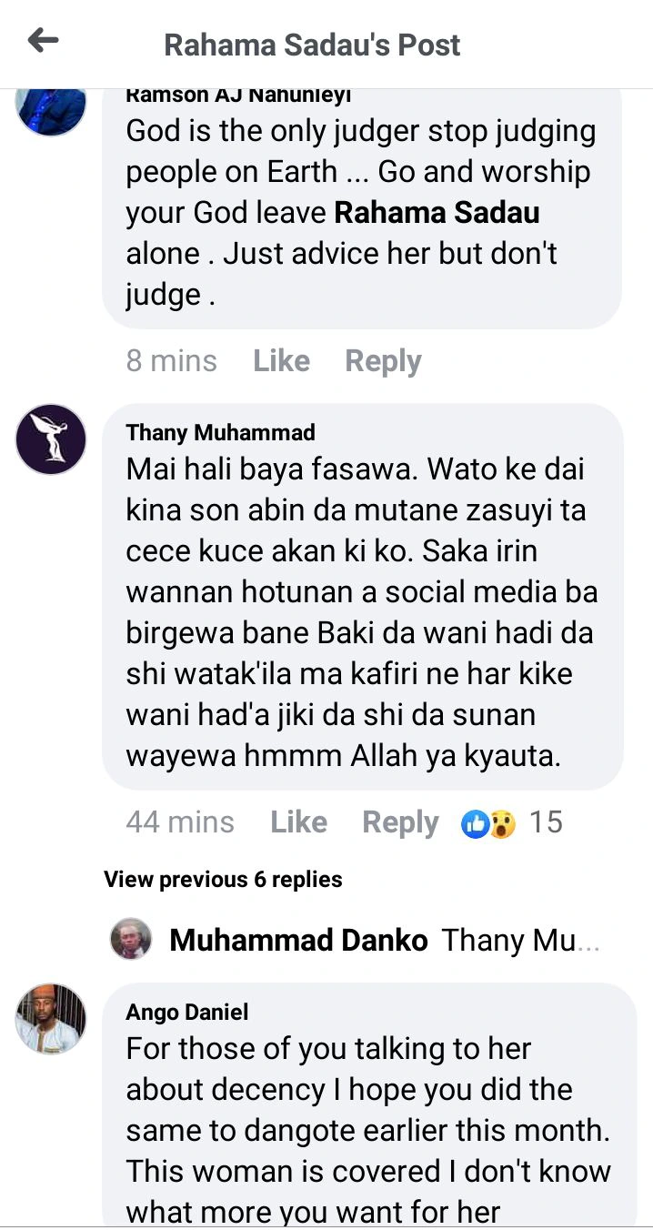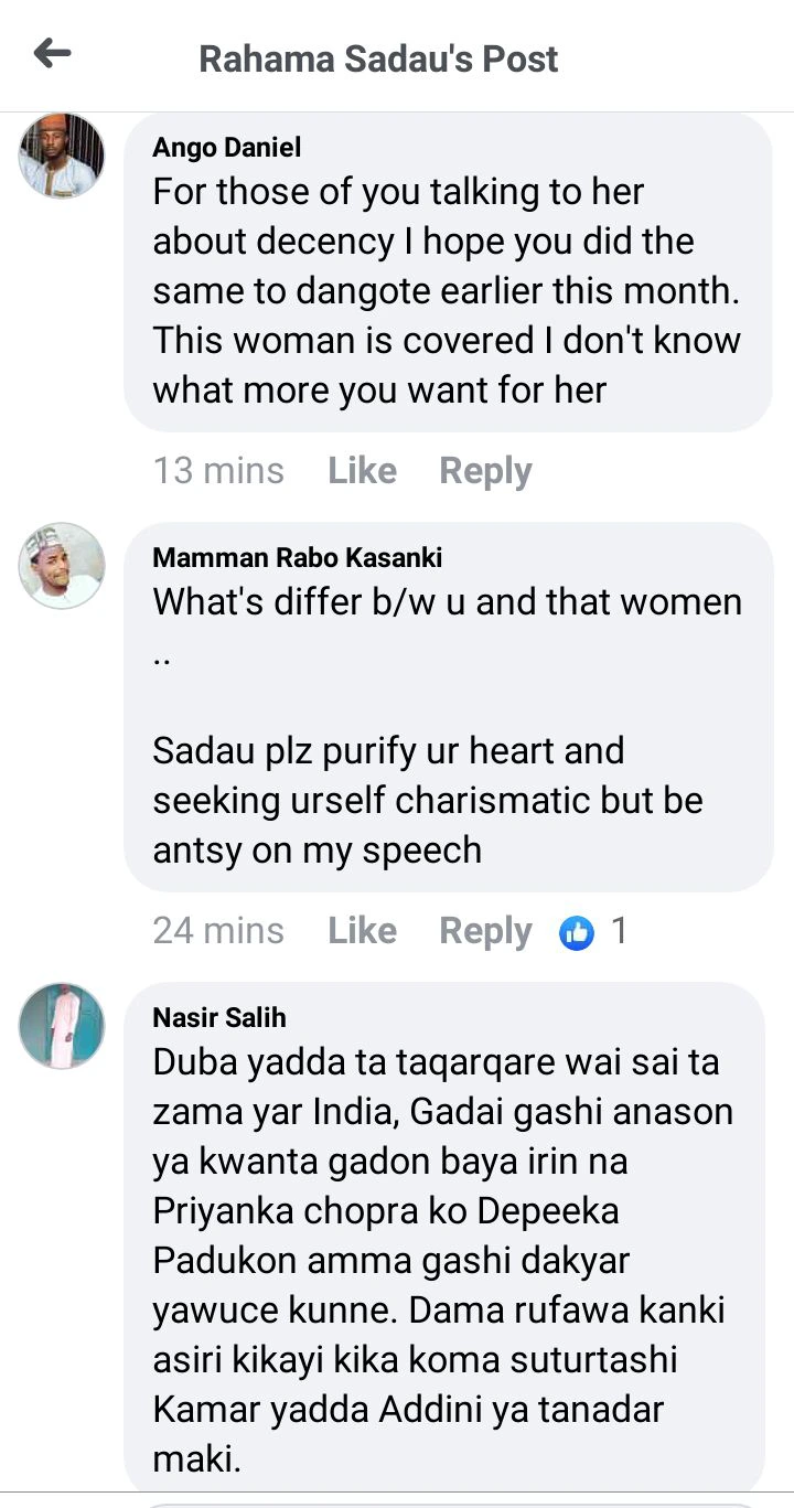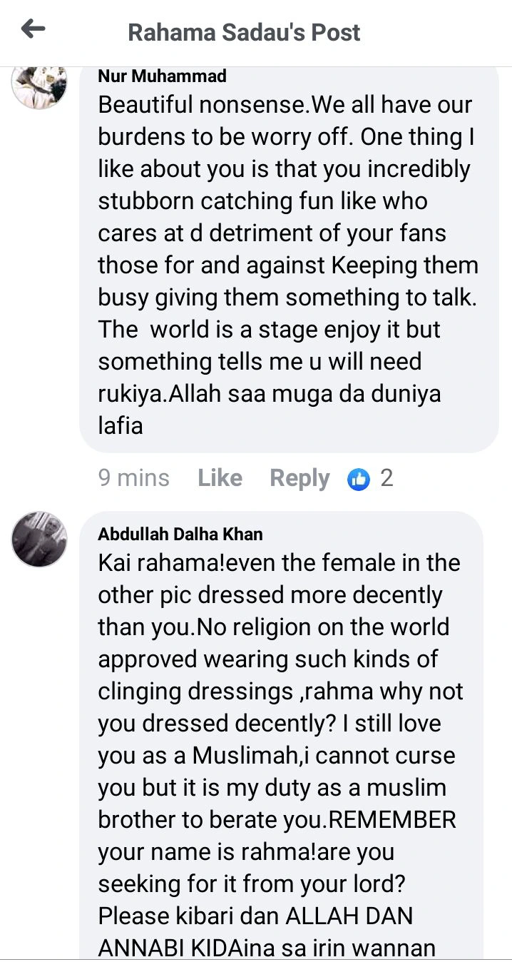 Many of her facebook friends blast her mode of dressing in the pictures, with some saying the other woman in the pictures dressed more decently than Rahma. Below are some screenshots of how some Northerners react to the pictures.