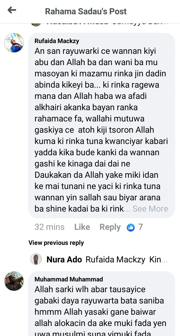 From the above screenshot, Rufaida Mackzy's comment is translated as, "We know it is your life style, you should fear only God, we are your fans, but we don't like what you are you doing". "Take life easy, for people to say good things about you after you die is a blessing, everyone must die, you should remember about hereafter life". "You just open your hair because you want become very popular, you should be grateful to what God has done for you, worship him accordingly and obey his orders.
